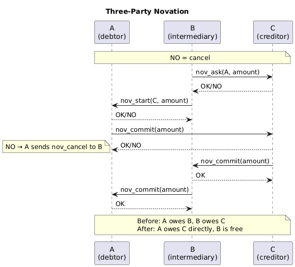 The three-party novation itself is that in A to B to C where B is an intermediary in terms of debt, B simply asks A and C to move the debt directly between themselves. This is then accounting-wise the same as A to bank to B to bank to C, but it is computationally decentralized.