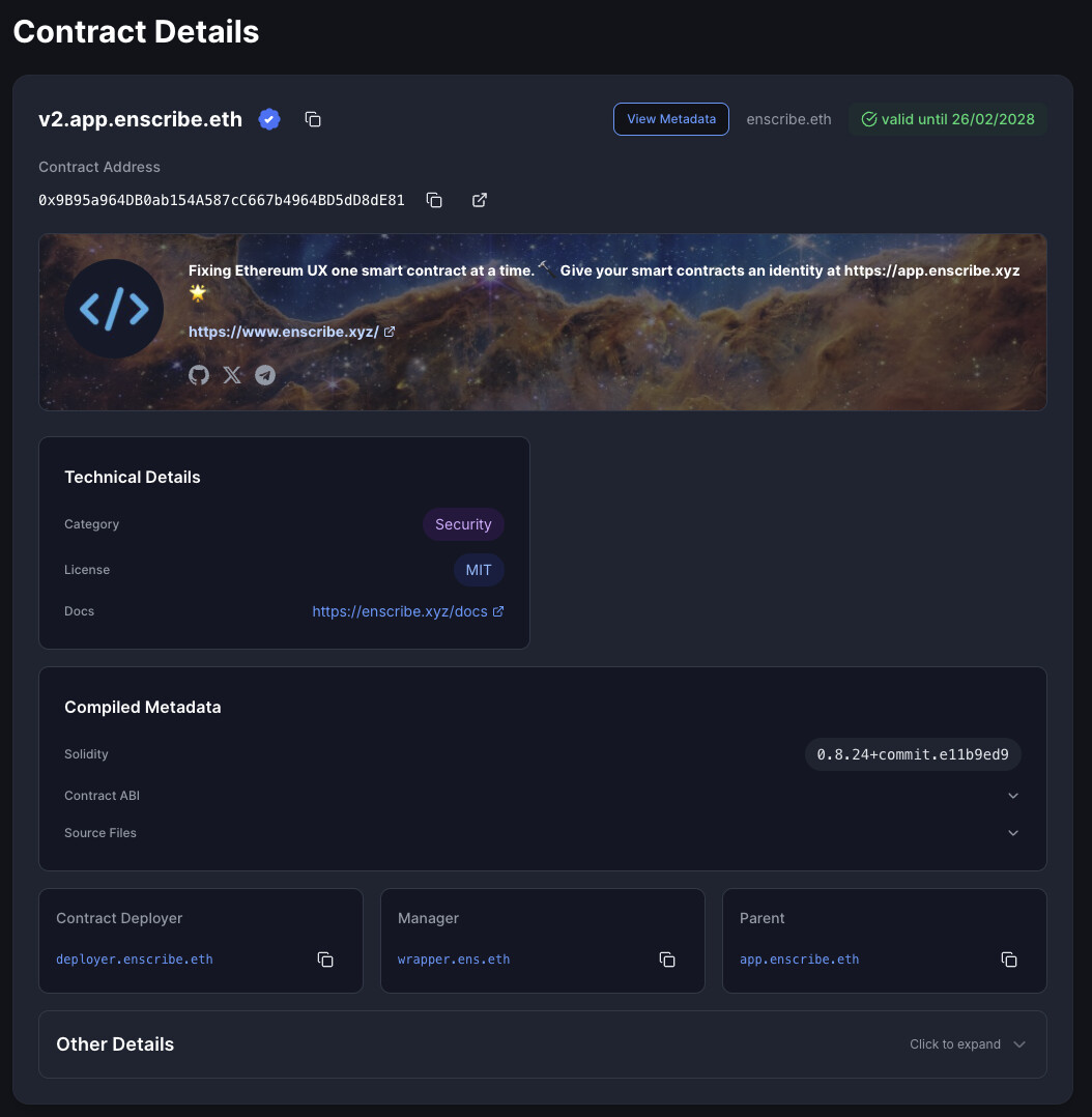 Using ENS, you can create onchain records such as the below record, which can provide a lot of trust for end consumers in smart contracts.