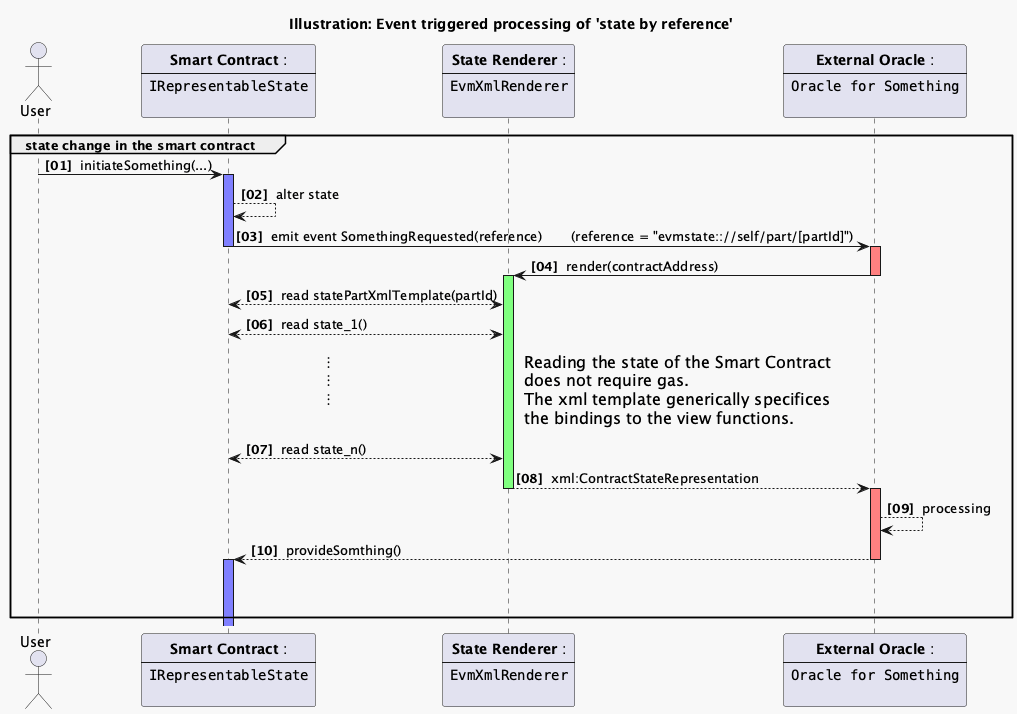 This ERC inverts that pattern by putting the smart contract in the centre. A contract declares that it implements IXMLRepresentableState and defines an interface of representable state. Off-chain renderers can then derive a canonical XML document that reflects the semantically relevant state of the contract at a given (chain-id, address, block-number), using only eth_call and a standardized XML binding schema. Rendering happens entirely off-chain and does not change state, so there is no gas cost, yet the resulting XML remains cryptographically anchored to the chain.