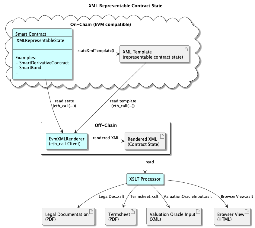 In the traditional off-chain world, such needs are addressed by standards like FpML, the ISDA Common Domain Model, or the ICMA Bond Data Taxonomy. A common pattern is to treat an XML (or similar) document as the definitive source defining the financial product and then generate code to interact with the corresponding data. When a process modifies or updates properties of the product, developers must synchronize the smart contract’s internal state with the off-chain XML representation. Today, each project typically invents its own set of view functions and off-chain conventions, so clients need bespoke code to map contract state into XML, JSON, or PDF. This makes interoperability, independent auditing, and reuse of tooling harder.