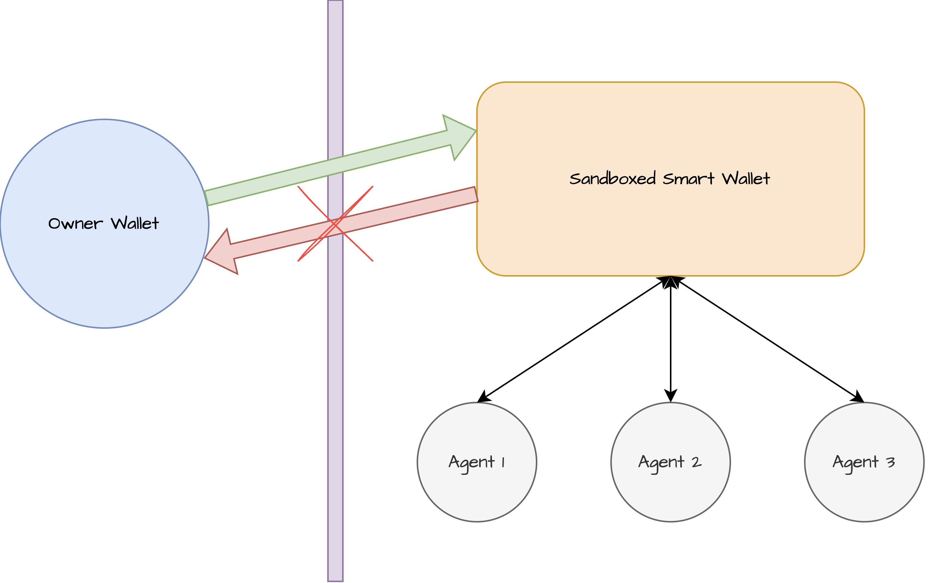 - Owner account persistently having access to sandboxed wallet: The relationship between owner account and sandboxed wallet is one-directional. The owner account has permission to withdraw assets, or remove the agent key from accessing the sandboxed wallet. While the sandboxed wallet does not possess any rights against the owner account.