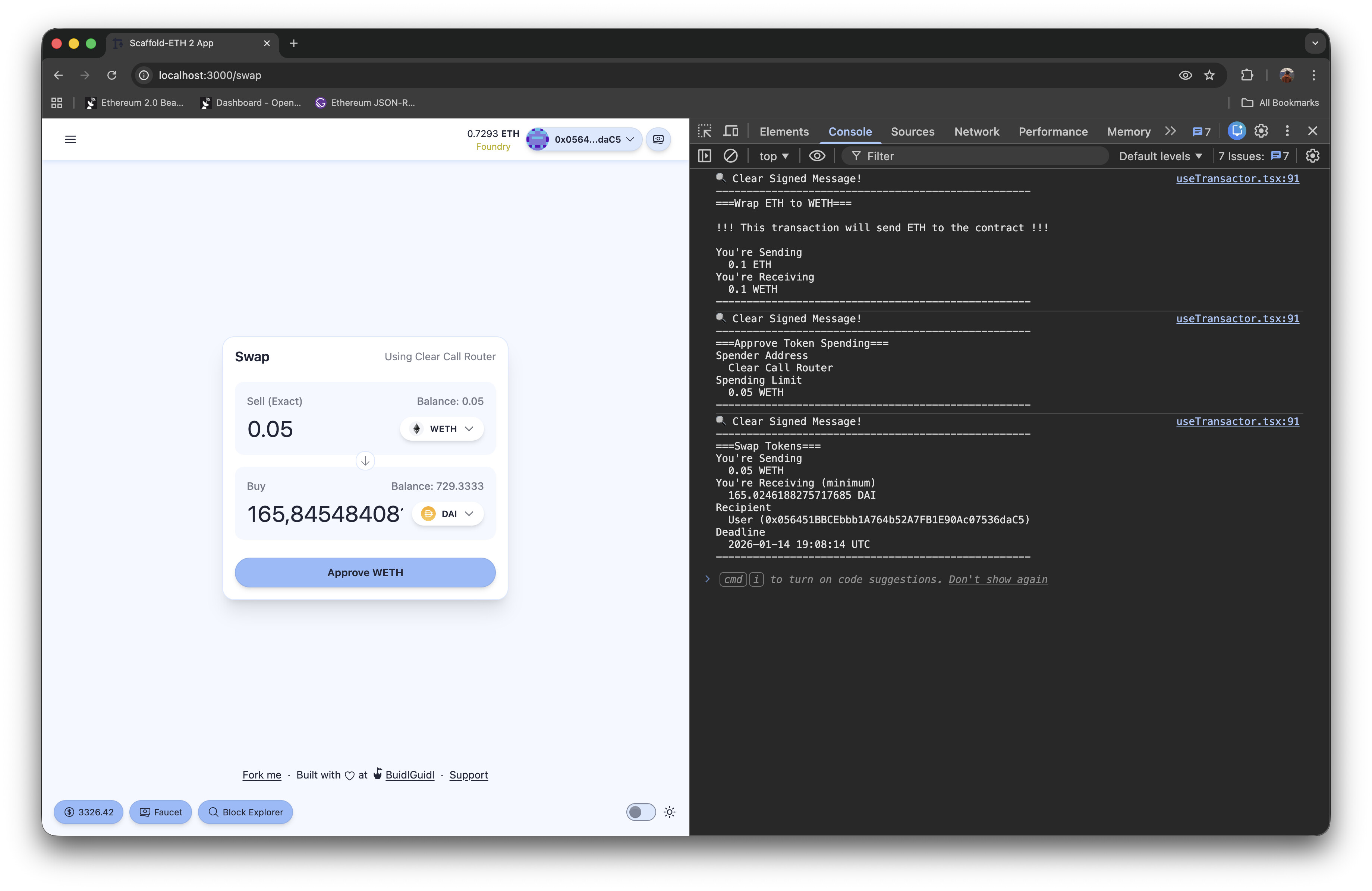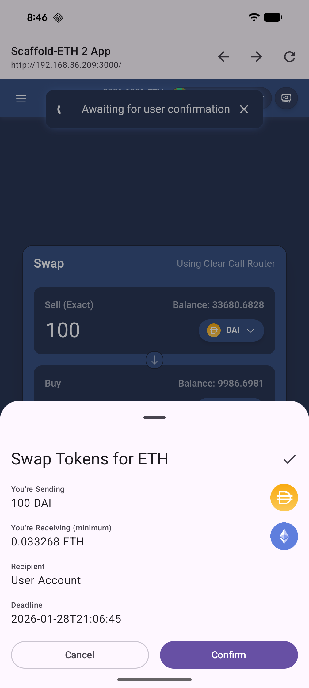 call renders nested execution. Smart contract wallets, multisigs, and DAOs wrap inner transactions as ABI parameters; call recursively renders the inner call using its own display specification, enabling complete call tree visualization for account abstraction (ERC-4337), multisig execution, and DAO proposals.