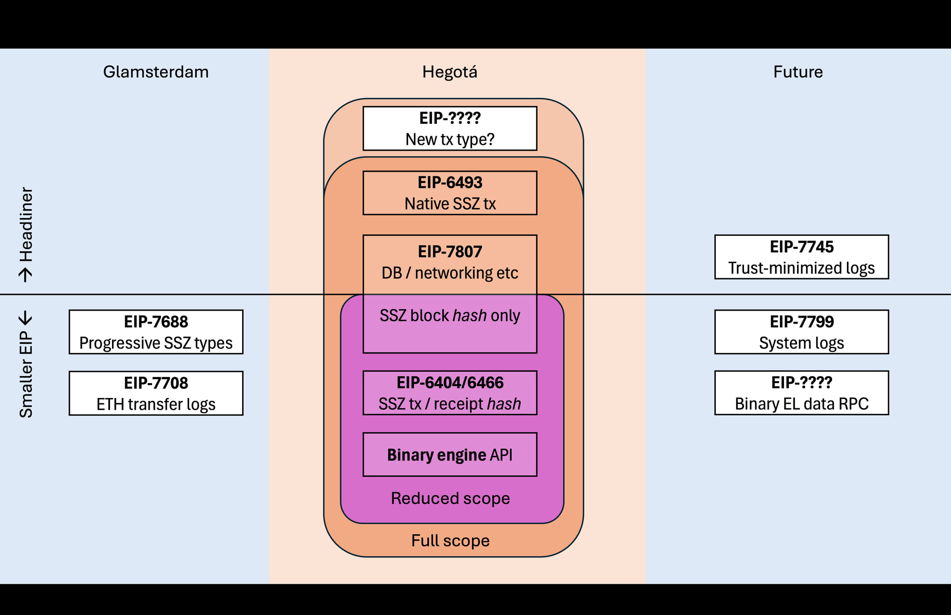 - The scope could be reduced to non-headliner by doing just the hashing changes (i.e., transactions_root, receipts_root, withdrawals_root, and block_hash). Potentially complex updates to database, network, and internal logic no longer has to be synced across implementations. However, EIP-6493 may have to be deferred as it adds new functionality instead of just revamping an existing hash.