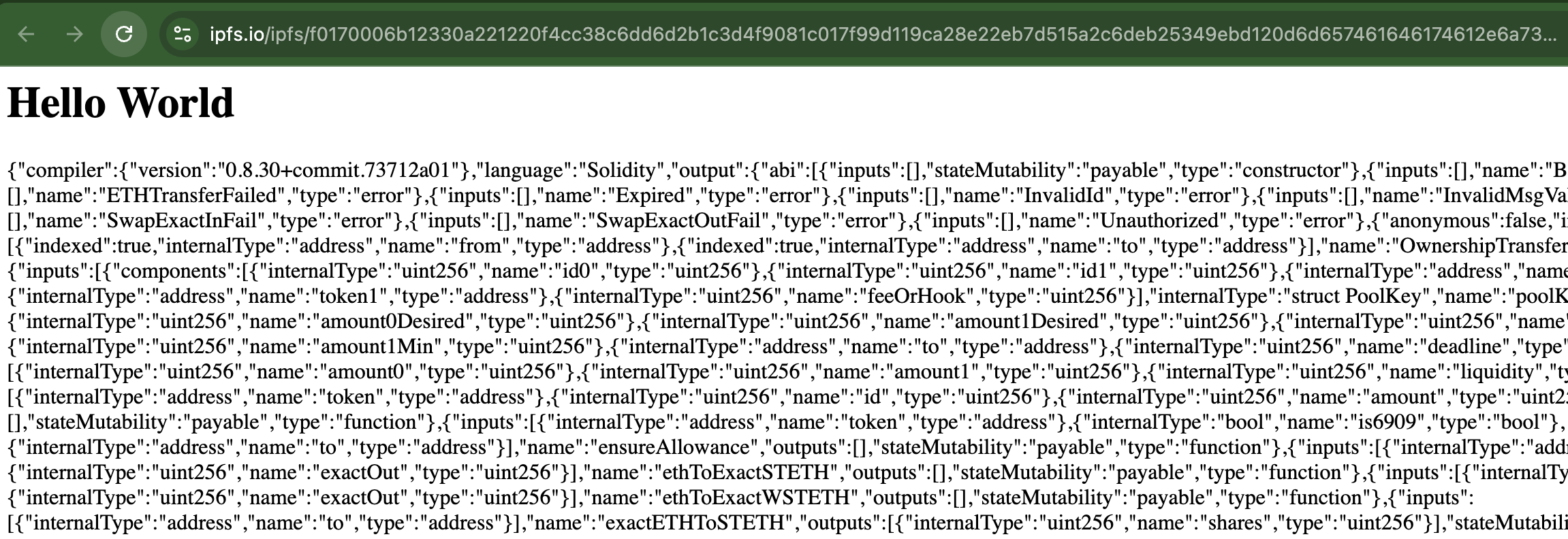 bytes internal index_html_cid = hex"122003d76bfe86d06e9a7a6b044b8979d7961078bef8b1673b6205a7da071ede6b51";