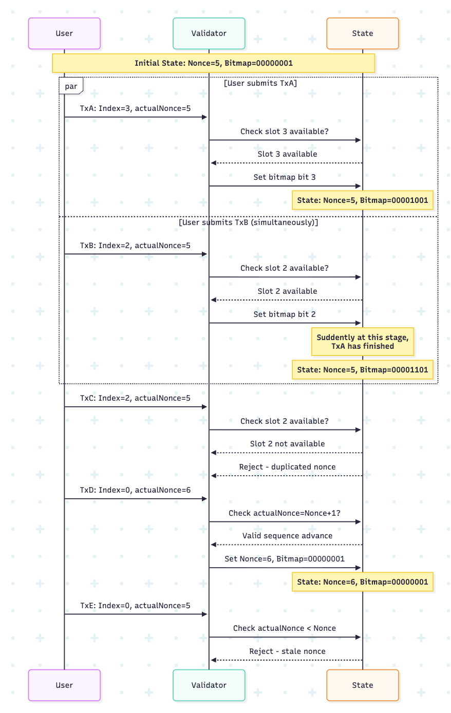 Let’s consider the following transaction sequence. It begins with an account where the current Nonce is 5 and the Bitmap shows slot 0 is already occupied. The user successfully submits two parallel transactions (TxA and TxB) at Nonce 5 using different slots (Index 2 and 3), and the validator updates the bitmap to mark these slots as used. TxA has finished during the time the validator processes TxB but it does not create any conflict.