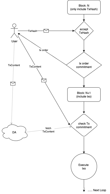 4. After users subscribe and query to see the ordering sequence number of their transaction hash committed on-chain, they send specific transaction content (including the remaining gasfee) to the chain and DA (DA is optional)